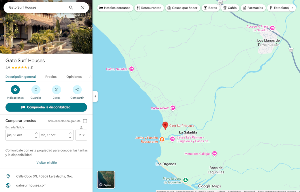 📍 Referencia en Google Maps: Se puede buscar directamente como Gato Surf Houses para evitar confusiones.
